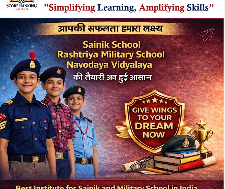 Score Ranking Institute is a dedicated coaching institute that prepares students for school entrance and defence-oriented examinations. We specialize in coaching for Sainik School, Rashtriya Military School , Navodaya Vidyalaya, and RIMC entrance exams.